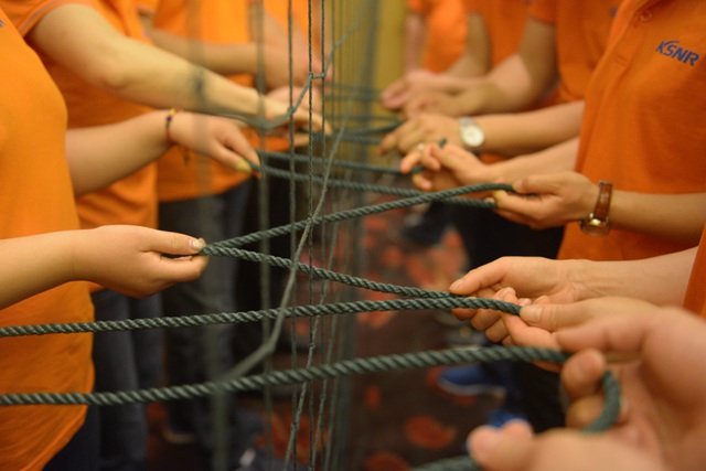 - 一個團隊的所有成員,在規定時間內,利用特殊的規則用一根長長地繩子,在不借助任何物品的情況下,穿過一個特殊蜘蛛網的每一個網洞。